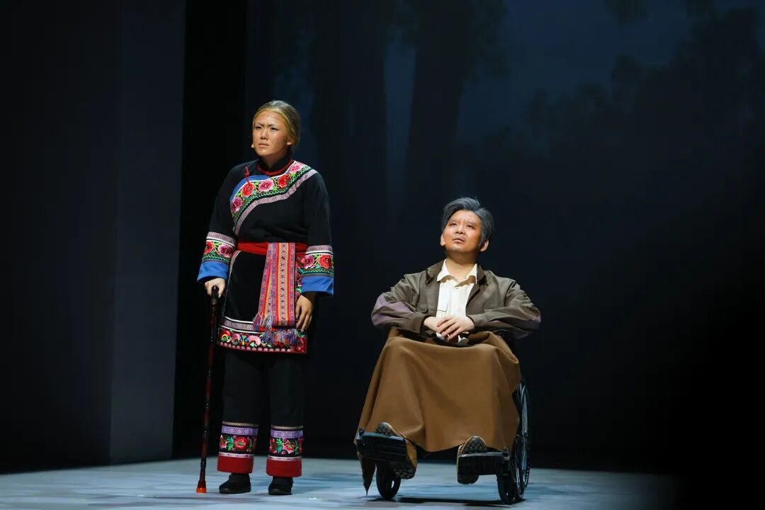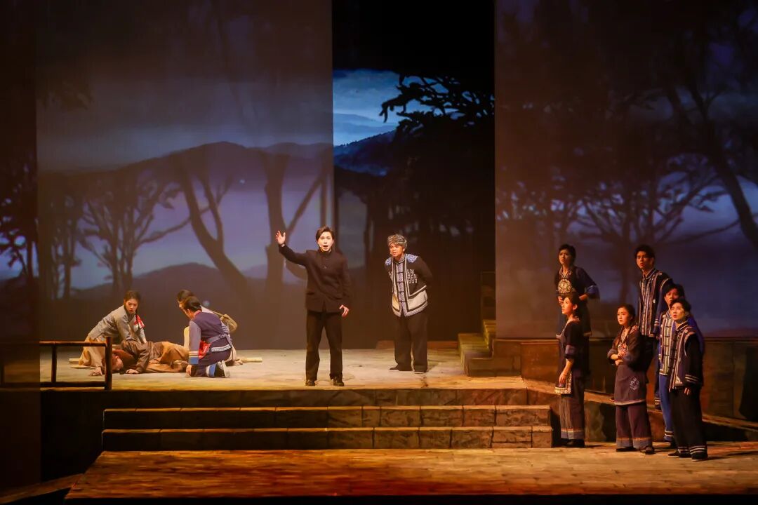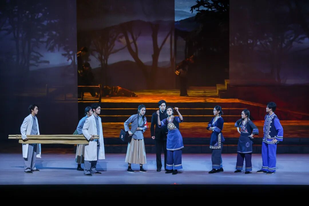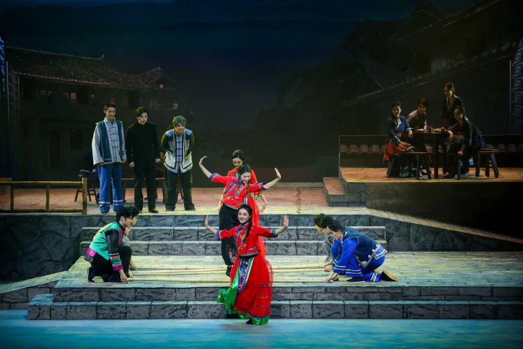 在藝術(shù)呈現(xiàn)上,作品巧妙運(yùn)用1944年與2025年雙時(shí)空交織的敘事結(jié)構(gòu),將畬族文化傳統(tǒng)、抗戰(zhàn)歷史記憶、英士大學(xué)辦學(xué)史與浙南山鄉(xiāng)獨(dú)特風(fēng)貌融入敘事。值得一提的是,作品深度融合畬族文化元素。劇中藍(lán)翠翠的唱腔保留了畬族山歌特有的顫音節(jié)奏,村民的集體舞蹈嚴(yán)格復(fù)刻了畬族“踏步擺腰”的傳統(tǒng)動(dòng)作,舞臺(tái)上的每個(gè)畫(huà)面都在訴說(shuō)著濃濃的民族風(fēng)情。