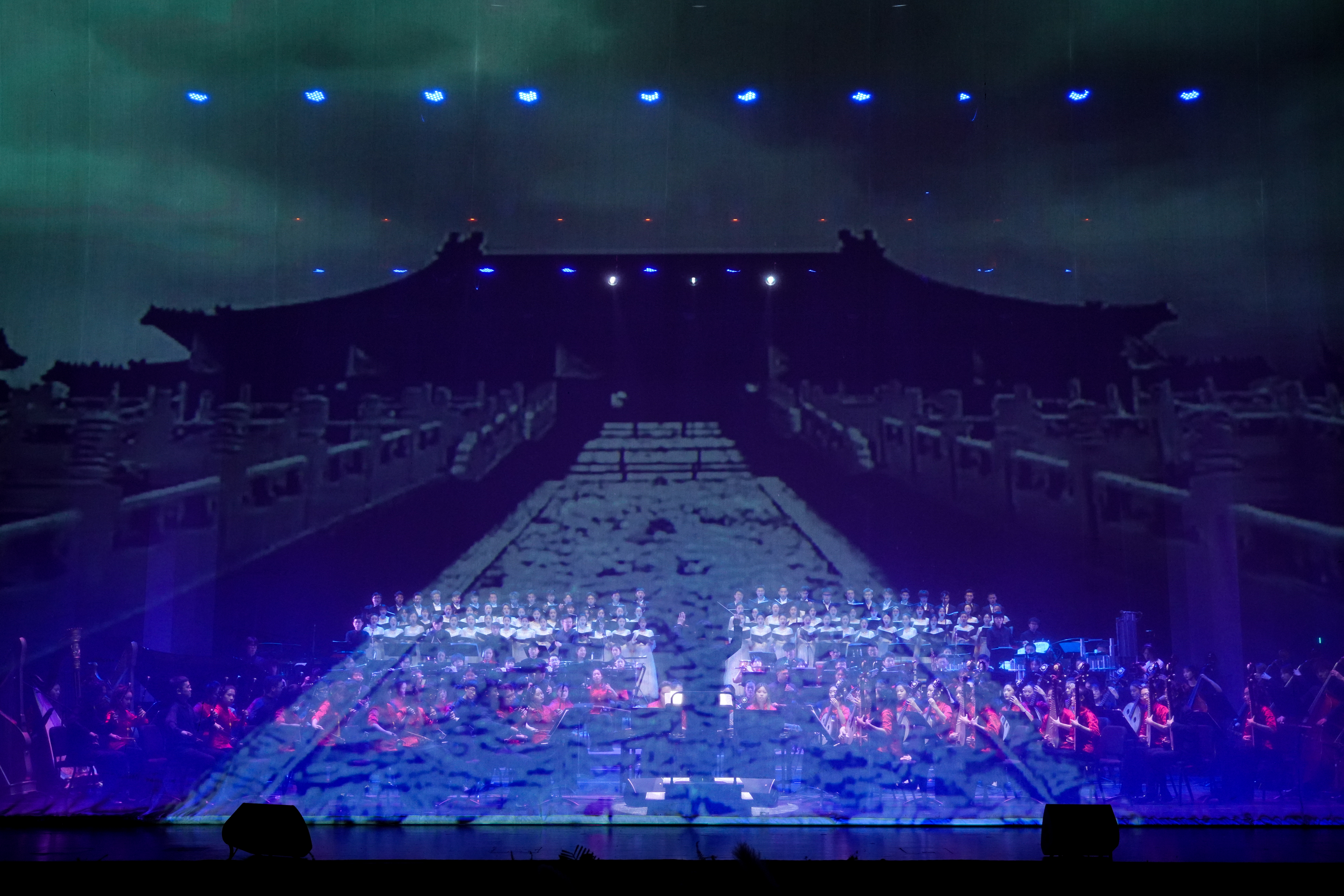 紗布之下,立意凝重的《甲午祭》緩緩奏響,重現(xiàn)了甲午戰(zhàn)爭的慘烈場景,回溯無法忘卻的歷史之痛,為本場音樂會拉開了帷幕。“太陽從這里升起,黎明之火燃向大地......”由藝術總監(jiān)王甫建詞曲的《太陽升起的地方》將現(xiàn)場觀眾的思緒換帶回百年前的小小紅船上。太陽露出了曙光,紅船從這里啟航,一曲《曙光·啟航》開啟了新的征程;《歲月如歌》將五首耳熟能詳?shù)募t色歷史歌曲聯(lián)奏,帶領現(xiàn)場觀眾追尋老一輩革命先輩的紅色足跡,進行一次歷史的回望;由毛澤東詩詞題材創(chuàng)作的民樂作品《沁園春·長沙》則讓人仿佛置身于生機勃勃的橘子洲頭,重溫中國共產(chǎn)黨帶領下走過的光輝歷程。