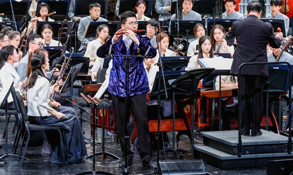 本場音樂會囊括了多個民族與地區(qū)的音樂。音樂會以《國風》拉開序幕,曲名取自先秦詩歌集,樂曲化用《梅花三弄》的曲調(diào),唱出了各地民族的風俗習尚,展現(xiàn)了中華民族堅韌自強的精神品格。旋律鋪陳,似走筆行云流水;絲弦撥動,似佩環(huán)鳴動淙琤,俯仰之間便成《蘭亭》華章,文人之高曠深致盡在箏音中。“我們新疆好地方啊,天山南北好牧場”,樂曲起之徐緩平穩(wěn),逐漸歡快,女聲敘嘆新疆美景,歌詞抒發(fā)援疆情懷,以熱烈的舞蹈性將《我們新疆好地方》推向高潮。高亢笛聲奏出山歌性的旋律,特殊調(diào)式營造出奇譎的氣氛,在傳統(tǒng)與現(xiàn)代結(jié)合的音樂語匯下,一曲《飛歌》令聽眾身處西南邊陲,共賞奇麗峭拔的山川景物。悶雷滾動,大地在《風之歌》中蘇醒,悠揚婉轉(zhuǎn)的長調(diào)為觀眾緩緩鋪開一幅草原圖景,曲調(diào)與節(jié)奏隨著器樂模仿出的呼麥與馬蹄聲逐漸粗獷豪放,展現(xiàn)出具有蒙族特色的歡騰景象。竹笛與嗩吶吹奏出膾炙人口的《阿里郎》,兩首民歌的串燒銜接自然連貫,柔和悠長的旋律與歡悅的三拍子,仿佛在模仿朝鮮族人民的舞蹈,瀟灑而典雅。肅穆恬遠的旋律與鼓點將聽眾領(lǐng)入高山雪域,在四把中胡的領(lǐng)奏下,樂隊由慢到快,《弦子舞》展現(xiàn)出的舞蹈形象,時而端莊穩(wěn)重時而瀟灑飄逸,藏族人民載歌載舞的場景已在眼前。九州民族共一心,樂音贊頌團結(jié)情,走過中華大地的東西南北中,最后以《龍躍東方》作為收尾,八音克諧,配器多彩,鼓樂的雄渾激越,管弦的抒情雍容,在民歌素材《茉莉花》的串聯(lián)融合下,顯示出進取而不失溫潤的民族性格。