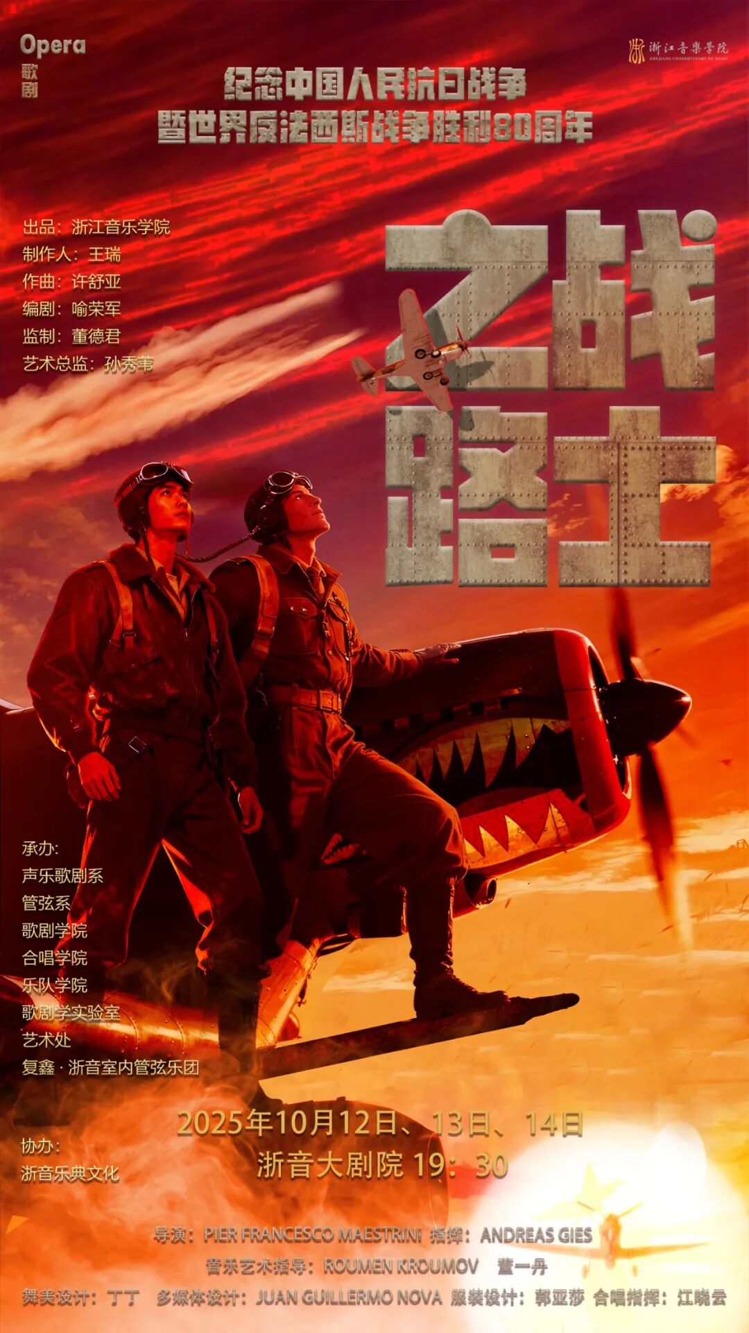 偉大的中國人民抗日戰(zhàn)爭(zhēng)開辟了世界反法西斯戰(zhàn)爭(zhēng)的東方主戰(zhàn)場(chǎng),為世界反法西斯戰(zhàn)爭(zhēng)勝利作出了重大貢獻(xiàn)和犧牲。歌劇《戰(zhàn)士之路》為紀(jì)念中國人民抗日戰(zhàn)爭(zhēng)暨世界反法西斯戰(zhàn)爭(zhēng)勝利80周年而作,全景式展現(xiàn)了1937年至1945年間,中美兩國軍民并肩戰(zhàn)斗共同抗擊日本法西斯侵略的壯麗史詩。全劇以磅礴的史詩筆觸再現(xiàn)了以陳納德為代表的飛虎隊(duì)員在中國戰(zhàn)場(chǎng)英勇戰(zhàn)斗的傳奇故事,以戰(zhàn)地記者陳香梅的視角揭開了歷史的面紗——戰(zhàn)火硝煙中的長空誓言既是兩人熾熱的愛情誓約,更是中美軍民并肩抗擊侵略的生死盟誓。讓我們走進(jìn)劇場(chǎng),聆聽和感受那段用生命譜寫的恢弘篇章,見證歷史星空中永不隕落的正義、忠貞與勇氣。