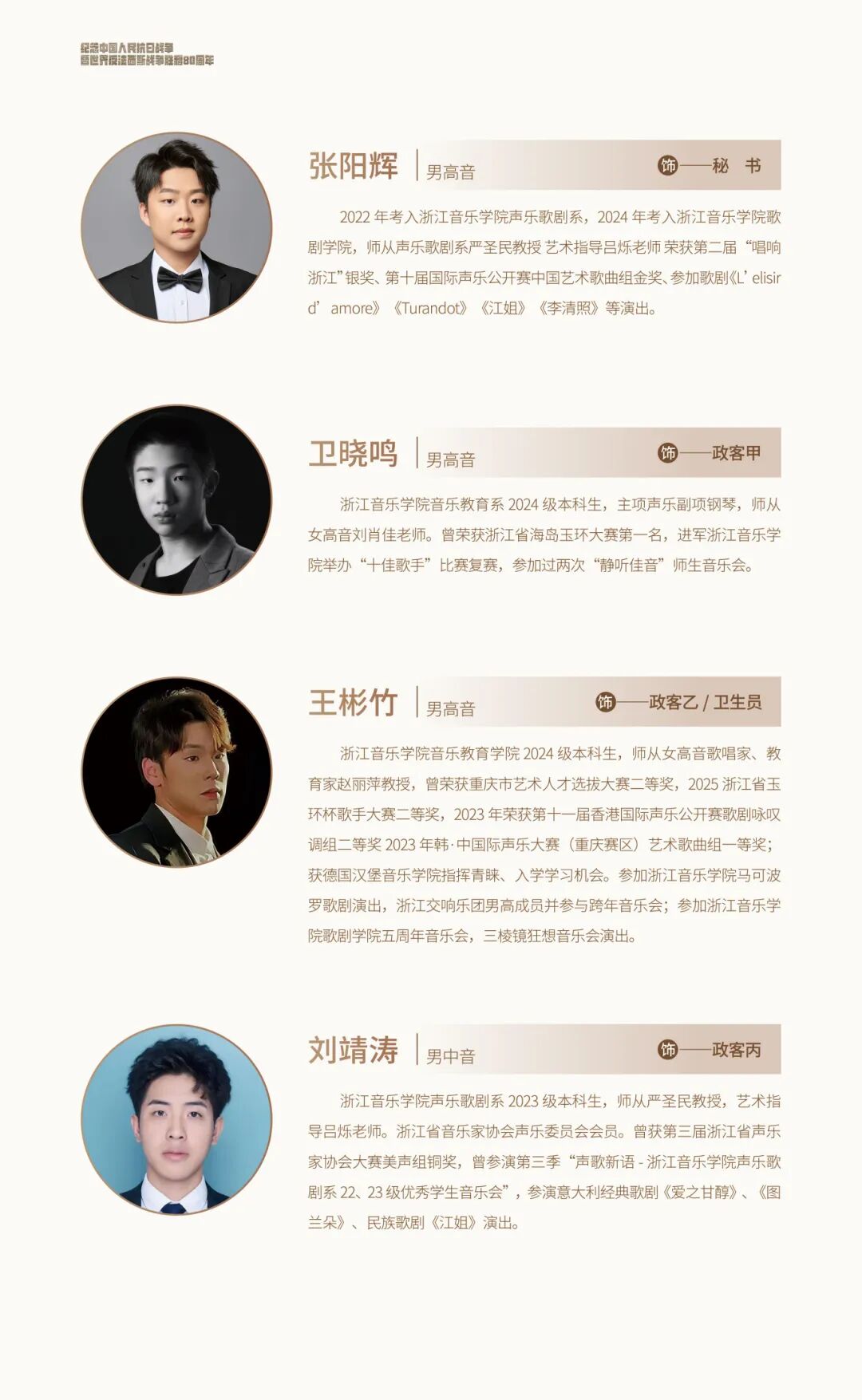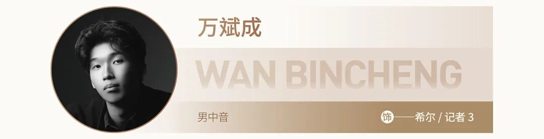 浙江音樂學(xué)院聲樂歌劇系2022級(jí)本科生,師從男高音歌唱家,浙江音樂學(xué)院聲樂歌劇系副教授劉偉老師,藝術(shù)指導(dǎo)鄒越老師。2024年考入浙江音樂學(xué)院歌劇學(xué)院。2023參演浙江音樂學(xué)院版歌劇《L’elisir D’amore》。2024參演浙江音樂學(xué)院版歌劇《圖蘭朵》,飾演PONG一角。