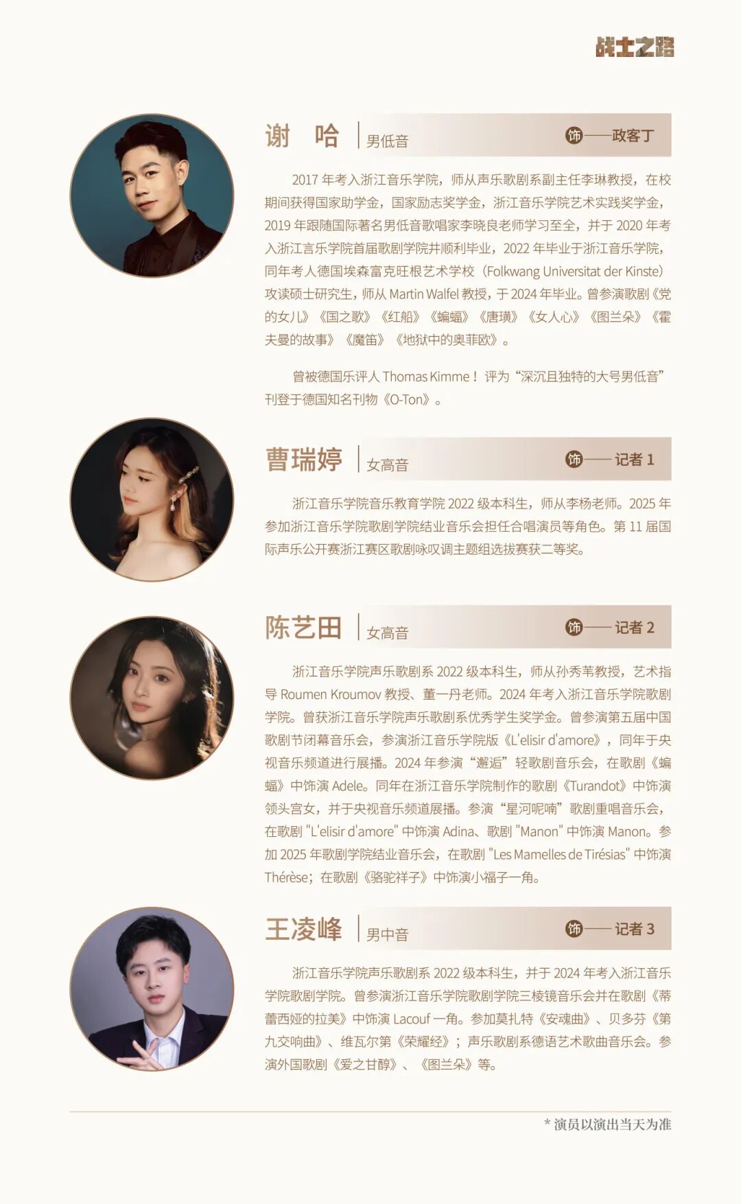 浙江音樂學(xué)院 聲樂歌劇系23級(jí)本科生,師從葉勇副教授。2023年獲第十屆國際聲樂公開賽歌劇詠嘆調(diào)專題組青年A組江蘇常州賽區(qū)一等獎(jiǎng),2025年獲貝哈愛樂樂團(tuán)主辦的意大利的世界級(jí)歌劇比賽一第77屆阿斯立科國際青年歌劇歌手大賽中國賽區(qū)三等獎(jiǎng)并入圍亞洲區(qū)總決賽。曾參演歌劇《愛之甘醇》《藝術(shù)家的生涯》《江姐》《李清照》《圖蘭朵》。