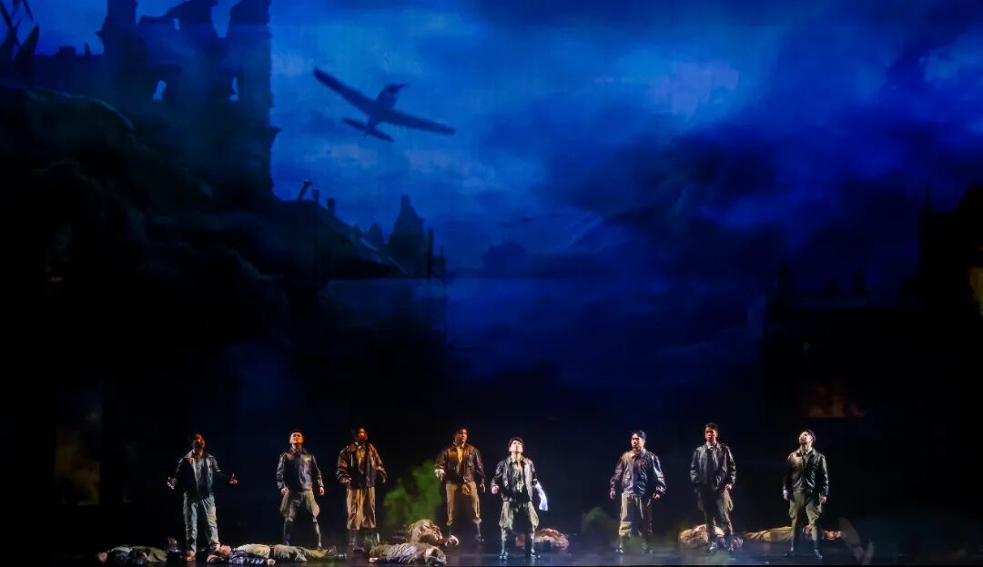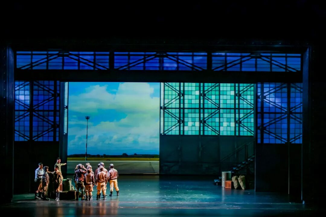 “本劇情景多、變化頻繁、多時空并列,遷換需要快速高效。”丁丁介紹,為此,他在舞臺三分之一深處,設置了一組可以開合的“云”景片,在深度上分割舞臺空間,功能上則保證前區(qū)演出時后區(qū)換景的遮擋需要,“云開云合”完成瞬間的空間重組、傳遞信息和情感,增強藝術感和觀賞性。加之現(xiàn)場以冷峻的鋼鐵結構象征戰(zhàn)爭的殘酷與男性的陽剛,配合多媒體技術營造空戰(zhàn)的激烈效果,最終呈現(xiàn)極具沖擊力的視覺畫面。