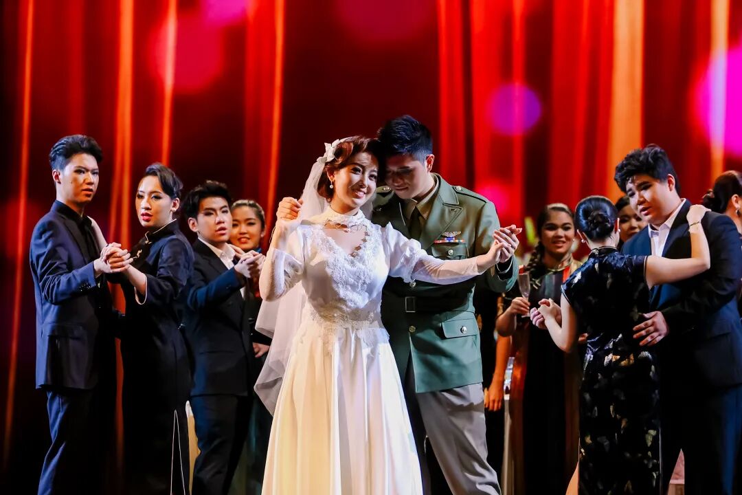 陳香梅的塑造則展現(xiàn)了戰(zhàn)火中女性的堅韌與成長,她柔和的女性魅力為歌劇的陽剛之氣增添了別樣色彩。飾演者由聲樂歌劇系教師方香蕾與歌劇學院的兩名學員金凡雅、多莉雅共同完成。方香蕾關注人物情緒的內在邏輯和真實本質:“通過深入內心,理清內在邏輯,再用內心激發(fā)聲音和身體的外在表達。”金凡雅則在排練演出中不斷深入角色內心,細化表演的每一個動作。剛上本科二年級的多莉雅則更注重尋找她與陳香梅的共通之處,“陳香梅成為記者時,跟我一樣也是20歲。”這是她出演的第一部歌劇,在老師們“手把手”的教導下迅速成長。“老師們的表演直擊內心,讓我真切體會到歌劇演員的魅力,也對歌劇表演有了全新的理解。”