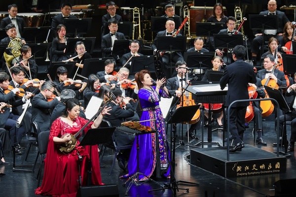 本次首演以中國傳統(tǒng)民歌為母題,通過“雙獨奏+大型交響樂團”這一獨特結(jié)構(gòu),依次演出了《沂蒙山》《飛歌》《繡荷包》《花兒》《囊瑪·鍋莊》《對鳥·采茶》《趕牲靈》《跳月》《牧歌》《東北風》《漁舟唱晚》《對花》12首新作,構(gòu)建綿延敘事的民族音樂圖景,實現(xiàn)傳統(tǒng)素材在當代舞臺上的再度升華。