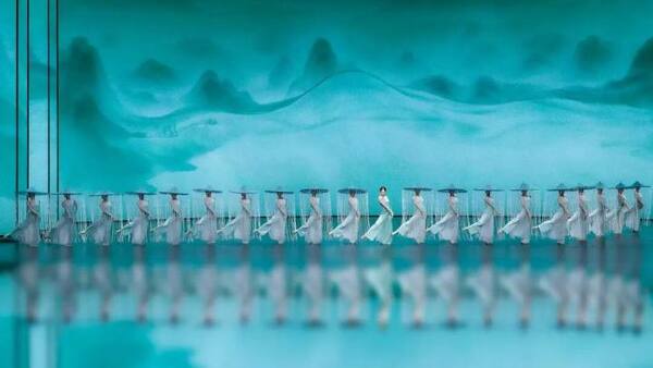 演出過程中不斷變換隊形,展現(xiàn)如“輕舟”“屋檐”“遠(yuǎn)山”等中國古典意蘊(yùn)的詩意構(gòu)圖,讓這場跨越千年的春雨在當(dāng)代舞臺上“潤物無聲”。