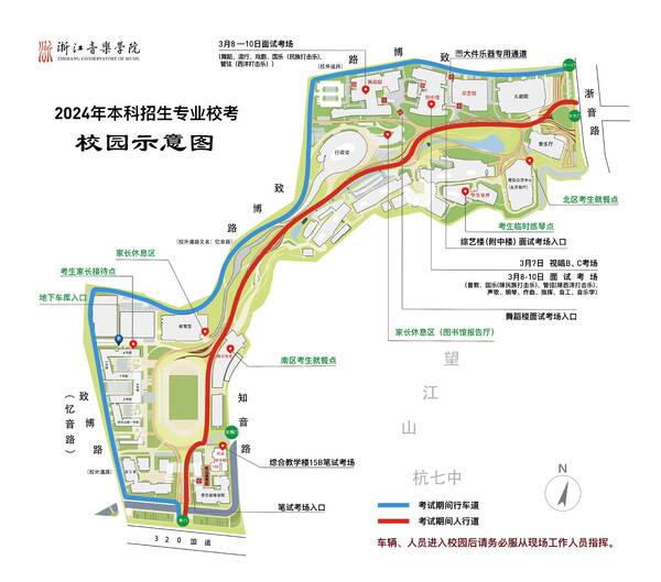 3月7日—10日,學校開放東1門、東大門、南門、東南門,在綜藝樓(附中樓)、舞蹈樓參加面試考試的考生,建議從浙音路東1門(行車道)或東大門(人行道)進入校園;在南區(qū)綜合教學樓15B參加筆試考試的考生,建議從南門、東南門進入校園。如乘坐地鐵6號線到浙江音樂學院站,可從知音路“浙江音樂學院東南門”進入校園。