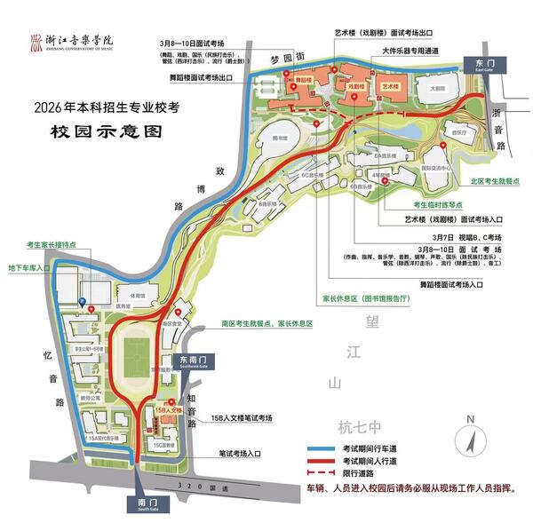 3月7日—10日,學(xué)校開放東1門、東大門、南門、東南門,在藝術(shù)樓(戲劇樓)、舞蹈樓參加面試考試的考生,建議從浙音路東1門(行車道)或東大門(人行道)進(jìn)入校園;在南區(qū)15B人文樓參加筆試考試的考生,建議從南門、東南門進(jìn)入校園。如乘坐地鐵6號線到浙江音樂學(xué)院站,可從“浙江音樂學(xué)院南門”進(jìn)入校園。