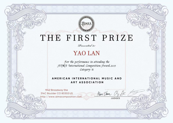 近日,美國AIMA國際作曲比賽落下帷幕,我校作曲與指揮系學(xué)生姚瀾的作品《Turbulence》、吳睿驍同學(xué)的作品《狂想曲》在組別三(20—26歲)中雙雙獲得一等獎(jiǎng)。兩位同學(xué)均為作曲與指揮系20級(jí)本科生,指導(dǎo)老師李珺副教授。