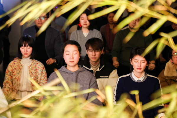 本次藝術(shù)周突破傳統(tǒng)演出框架,在參與感、體驗(yàn)性上作了大量創(chuàng)新設(shè)計(jì),將音樂聽賞體驗(yàn)升級(jí)為“沉浸式身心靈修復(fù)計(jì)劃”。特邀來自印度的資深瑜伽導(dǎo)師Mani引領(lǐng)觀眾通過呼吸冥想回歸身心本真;云南自然音樂人、手工樂器制作人阿堅(jiān)與笛簫演奏家孫源,攜親手斫制的原木、竹節(jié)等樂器登臺(tái),以風(fēng)聲、水滴、鳥鳴為靈感,奏響《山谷有聲》《空谷心音》《靈音凈心》等作品,將自然聲景的律動(dòng)引入西湖之畔。學(xué)院師生深度參與,國樂系杜竹松教授、章怡雯副教授帶領(lǐng)學(xué)生,用古琴獨(dú)奏、琴簫合奏等形式呈現(xiàn)了《流水》《關(guān)山月》《梅花三弄》等作品,讓觀眾感受到傳統(tǒng)國樂與自然美學(xué)深度融合的東方意境。每場演出均在參與共創(chuàng)的《詩經(jīng)·鹿鳴》音樂和鳴聲中圓滿落幕。