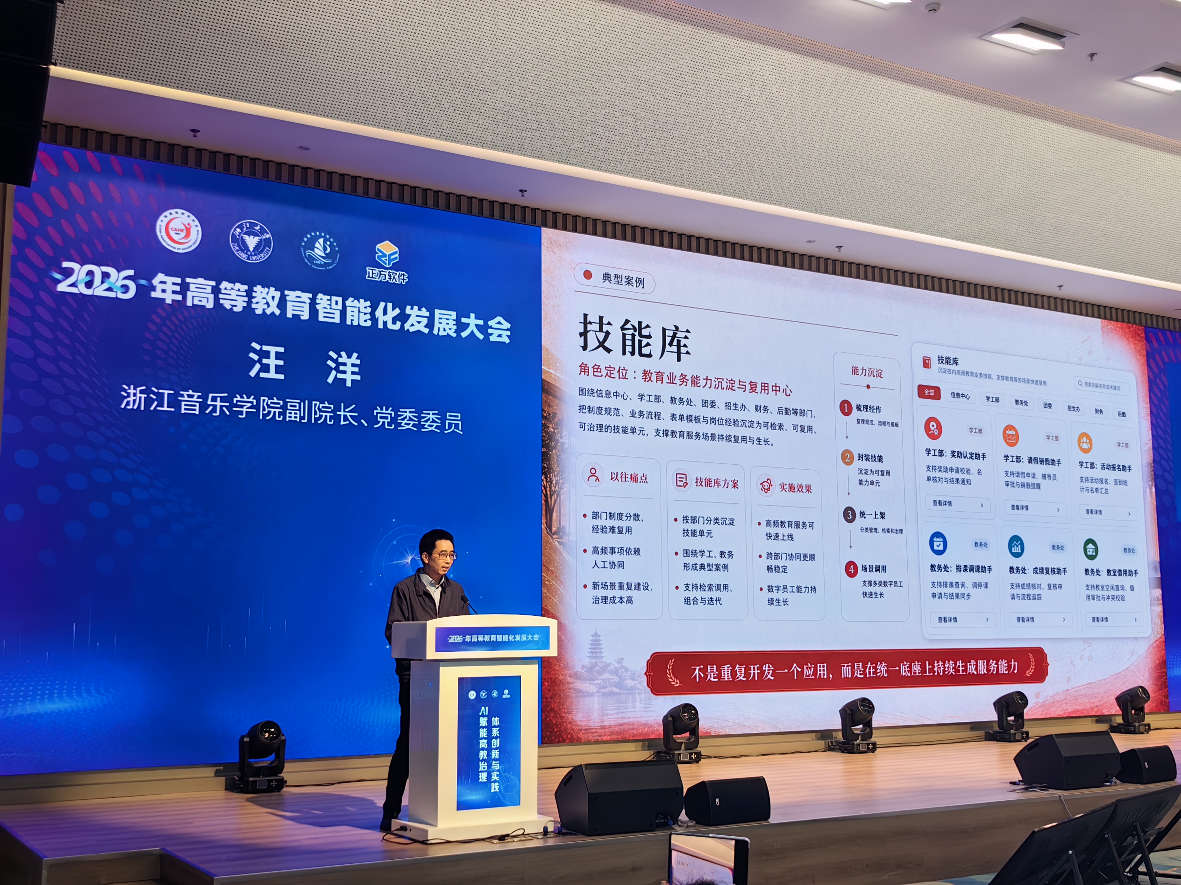 大會(huì)主題為AI賦能高教治理體系創(chuàng)新與實(shí)踐。會(huì)上,汪洋圍繞“人工智能賦能高校數(shù)字化公共服務(wù)能力創(chuàng)新發(fā)展”作《構(gòu)建數(shù)字員工:推動(dòng)高校公共服務(wù)從“有系統(tǒng)”到“好服務(wù)”》的專題報(bào)告,從現(xiàn)實(shí)背景、學(xué)校特色、價(jià)值判斷、核心方案、整體架構(gòu)、運(yùn)行機(jī)制、治理特征、典型案例等方面介紹了近年來浙音在人工智能賦能學(xué)校數(shù)字化公共服務(wù)能力創(chuàng)新發(fā)展方面的積極探索。汪洋表示,近年來,面對(duì)人工智能對(duì)教育底層邏輯和樣態(tài)重塑帶來系統(tǒng)性影響,浙音準(zhǔn)確識(shí)變、科學(xué)應(yīng)變、主動(dòng)求變,系統(tǒng)謀劃、精心部署、狠抓落實(shí),積極用好人工智能這一關(guān)鍵變量,以“人工智能+教育”為抓手,推動(dòng)人工智能融入教育全要素、全過程、全場(chǎng)景。專題報(bào)告引起與會(huì)人員的廣泛關(guān)注,在專題交流環(huán)節(jié),大家紛紛對(duì)浙音數(shù)字員工——“甜甜 60 秒”表現(xiàn)出濃厚的興趣。