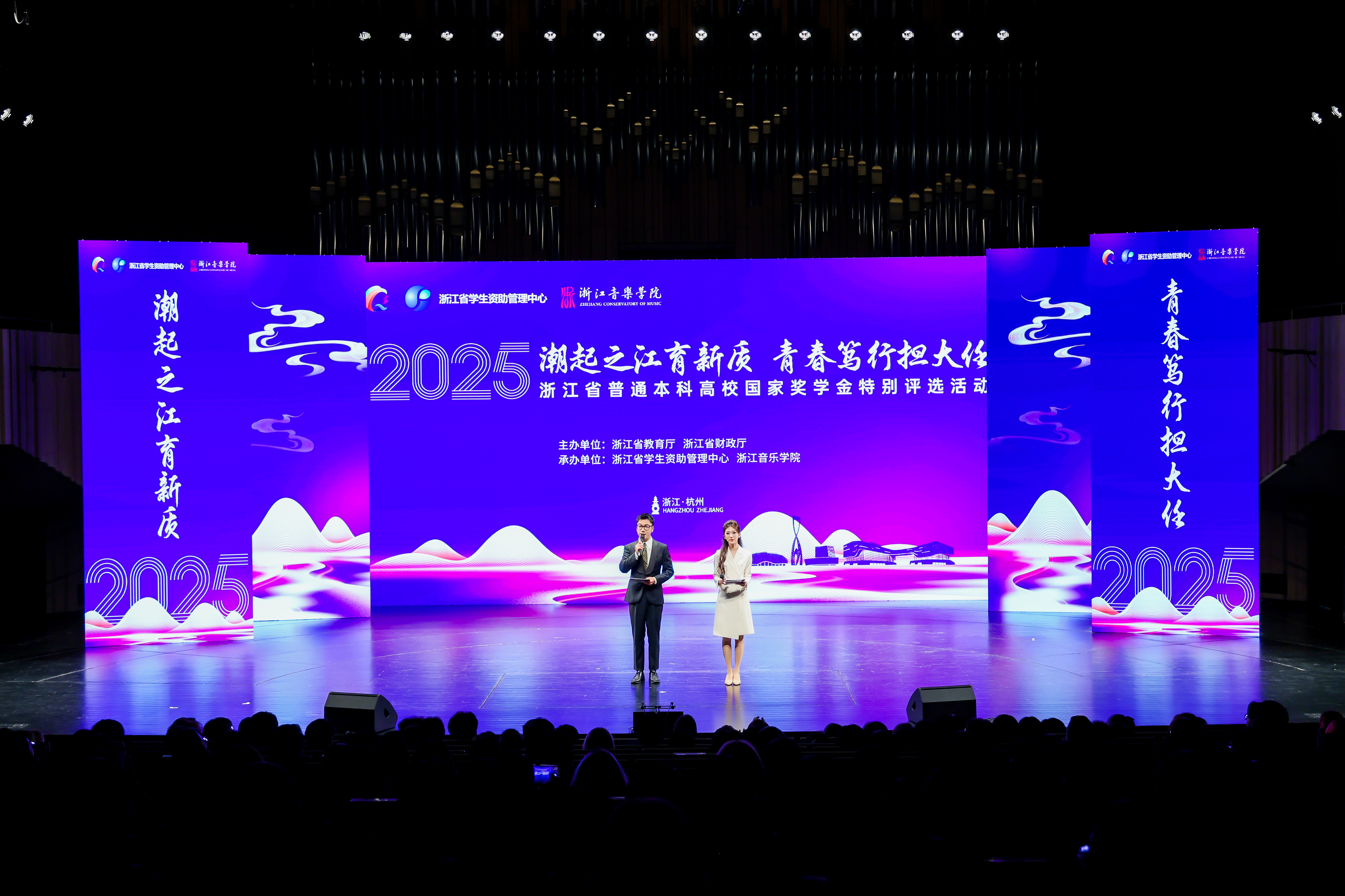 學(xué)院黨委副書記王均寅、蔡亦軍,浙江省教育發(fā)展中心、浙江省學(xué)生資助管理中心黨委委員、副主任章正春,浙江省教育廳財(cái)務(wù)處、浙江省財(cái)政廳科教處、浙江省教育宣傳中心數(shù)媒中心相關(guān)領(lǐng)導(dǎo),以及來自兄弟高校職能部門的專家評委、學(xué)生評委等出席活動(dòng)。500余名師生代表齊聚一堂,共同聆聽這場青春禮贊;近20余萬人次通過云端直播,與現(xiàn)場觀眾一同汲取榜樣的力量。