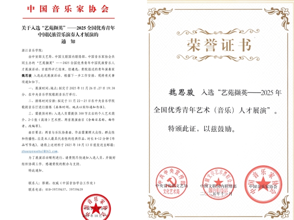 主辦方為獲得“2025藝苑擷英全國優(yōu)秀青年藝術(shù)人才”榮譽(yù)稱號的青年演奏家頒發(fā)榮譽(yù)證書。