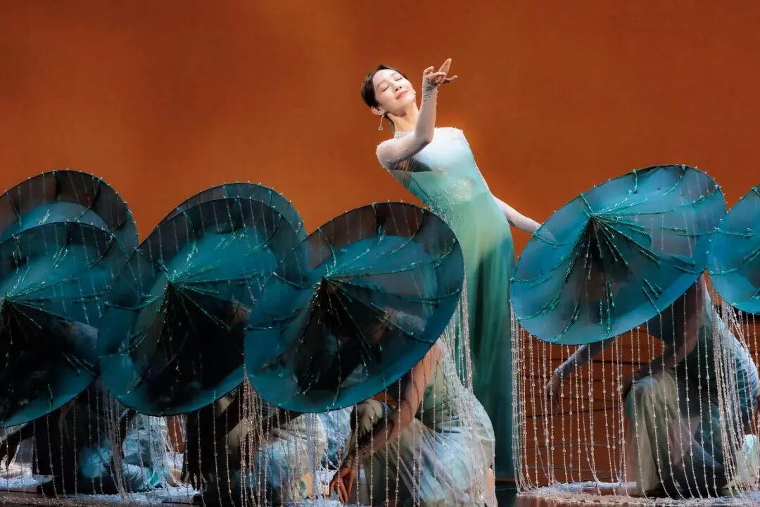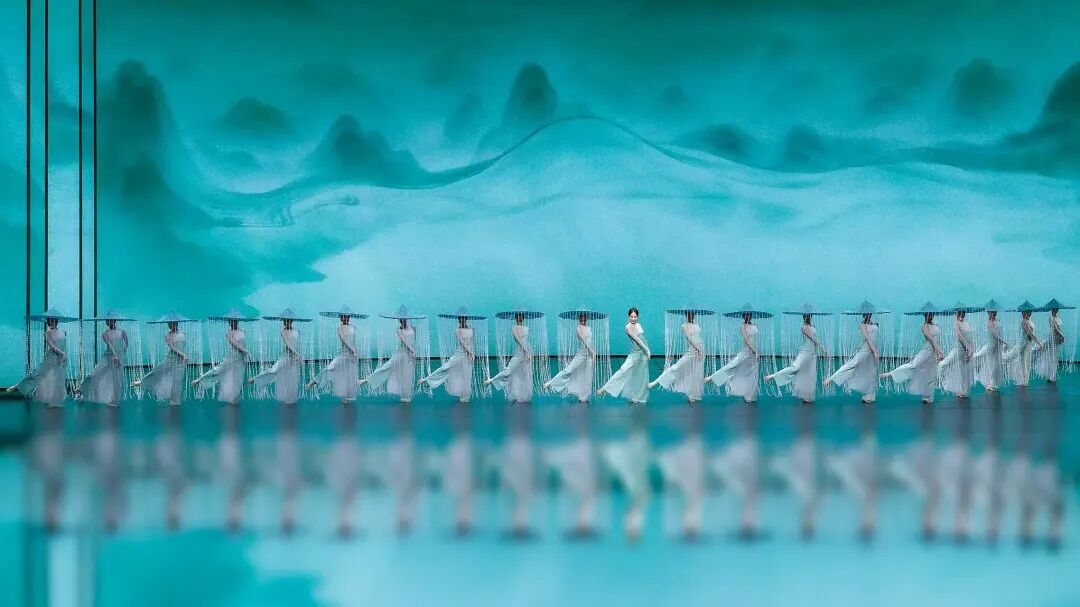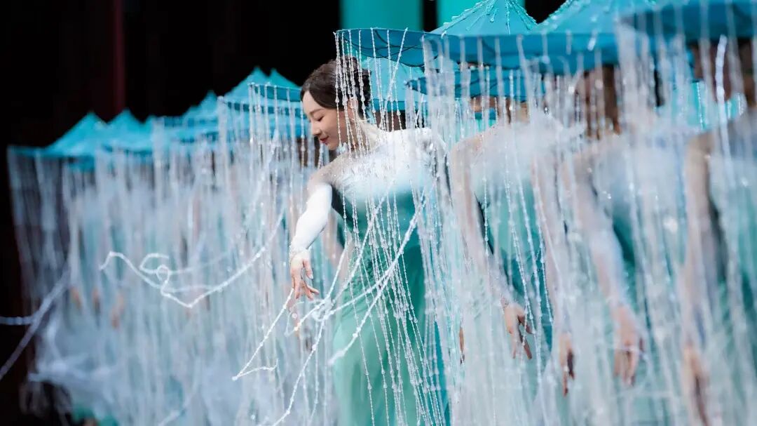 該作品以杜甫詩意為魂,以“雨”與“船”為眼,垂簾斗笠搖曳出斜風(fēng)細(xì)雨,步履如墨勾勒出青山遠(yuǎn)黛。舞者以小而細(xì)碎的動作,展現(xiàn)出詩詞中對雨不同形態(tài)的描述,如“廉纖”“跳珠”“銀索”“斜風(fēng)細(xì)雨”等,在動靜相宜間完成對江南品格的美學(xué)定幀。舞者們不斷變換隊形,展現(xiàn)如“輕舟”“屋檐”“遠(yuǎn)山”等中國古典意蘊的詩意構(gòu)圖,讓這場跨越千年的春雨在當(dāng)代舞臺上“潤物無聲”。