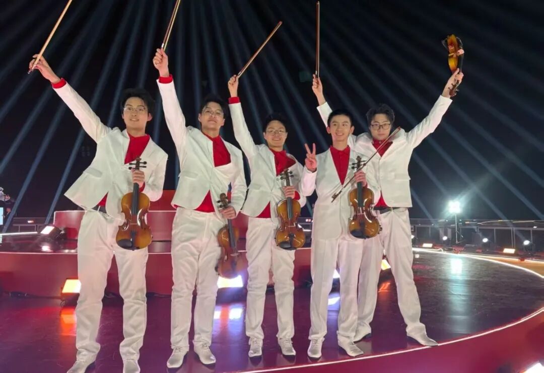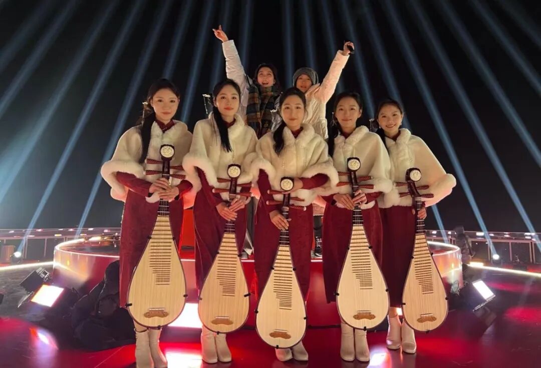 義烏的深冬,薄霧凜風(fēng)。在義烏之巔城市觀景臺的“蛋糕形”舞臺上,浙音民族室內(nèi)樂團演奏員黃琳、譚紫玲及國樂系研究生馮葉、王理、程寒千組成的五人琵琶小組,與管弦系學(xué)生林宏俊等小提琴演奏員、舞蹈演員共同完成開場演奏。“雖然琵琶部分僅占30秒,鏡頭可能一閃而過,但能登上國家級舞臺,我們感到無比自豪。”演奏員們說道。短短30秒,是在寒風(fēng)中無數(shù)次凍僵又搓熱的指尖換來的綻放,是鏡頭之外無數(shù)汗水凝結(jié)成的瞬間——這便是浙音人對“臺上一分鐘”最真實的注解。