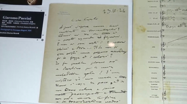 里科爾迪歷史檔案館的珍貴藏品遠(yuǎn)渡重洋——除了氣勢(shì)恢宏的親筆總譜外,亮點(diǎn)還包括普契尼最后日子里創(chuàng)作的鉛筆素描草稿、由弗蘭科·阿爾法諾完成的續(xù)寫結(jié)尾,以及阿爾圖羅·托斯卡尼尼在斯卡拉歌劇院排練時(shí)注釋過的樂譜等。而緊鄰這些百年遺物的,是一段由人工智能生成的動(dòng)態(tài)影像——設(shè)計(jì)師借助AI,將原始草圖重構(gòu)為流動(dòng)的、充滿未來感的舞臺(tái)幻境。傳世文物與現(xiàn)代科技交融,大師的藝術(shù)精粹與文化傳承穿越時(shí)光與當(dāng)代觀眾靜靜凝望。
