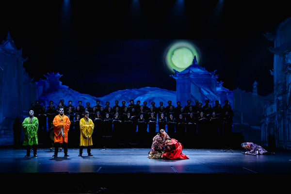 這場(chǎng)演出,仿佛是一場(chǎng)穿越百年、中西方文明的雙向凝視。舞臺(tái)視覺上,舞美設(shè)計(jì)師沒有追求所謂的“真實(shí)”,而是忠實(shí)還原了普契尼時(shí)代西方人對(duì)東方的浪漫“想象”——舞臺(tái)布景源自1924年斯卡拉歌劇院的原始手稿,簡(jiǎn)潔而富有象征意味,借助多媒體等現(xiàn)代技術(shù),在舞臺(tái)上勾勒還原出一個(gè)由絲綢、瓷器和茉莉花編織的東方夢(mèng)境,體現(xiàn)了強(qiáng)烈的學(xué)術(shù)性和歷史還原度。